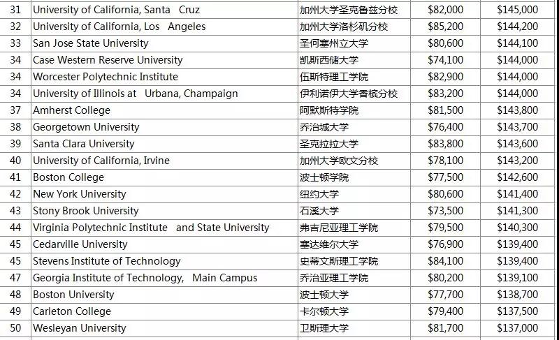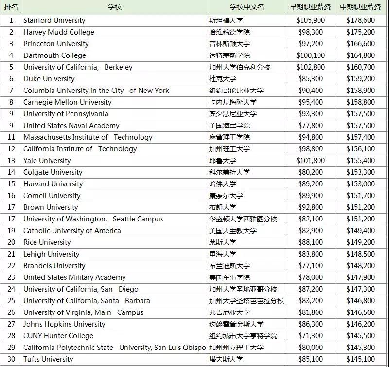 2019Payscale美国大学计算机科学类专业毕业生薪酬榜
