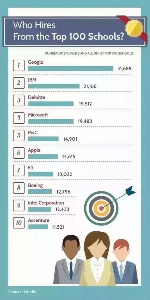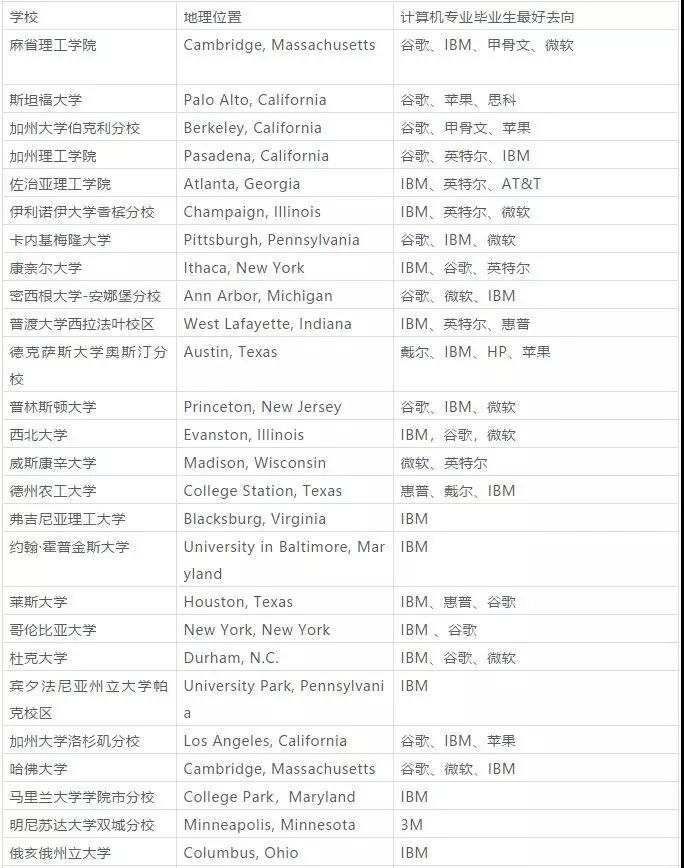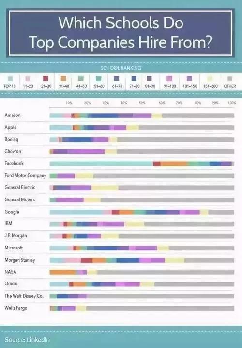 看过了薪酬排名,再来看一下美国各大学CS专业就业率的情况吧。 根据LinkeIn对各大行业巨头员工学校背景调查,这些顶尖公司的雇员都来自于哪些名校呢?
