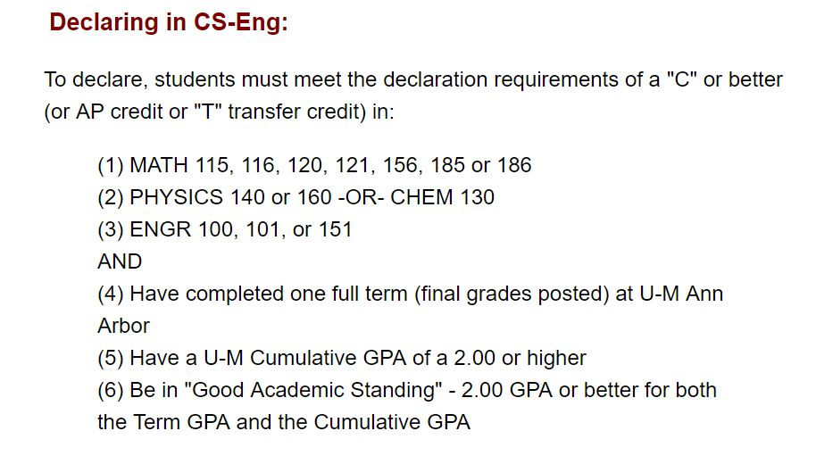 如图所示,工程学院的计算机科学项目在数学、物理、工程学课程有些前置要求,其中一项还提到了需要在 U-M 完成一学期。