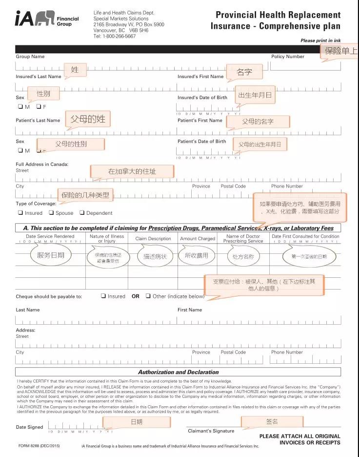 2. 请学生携带理赔表格(可以在保险公司网站 http://www.vhip.ca/forms-2/ 下载。)学生基本信息自己填写,病情诊断内容由医生填写;