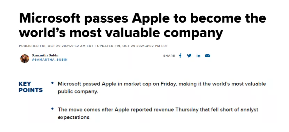 首先是市值。美东时间2021年10月29日,微软一度超越苹果,成为市值最高的公司。