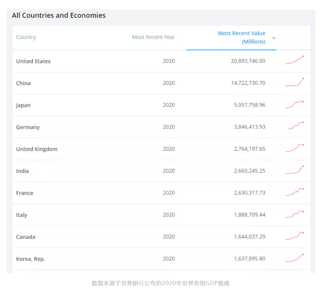 数据来源于世界银行公布的2020年世界各国GDP数值