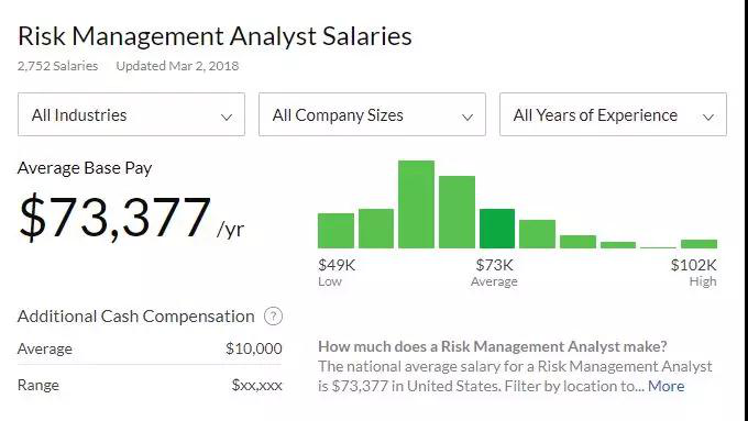 Risk Management Analyst光是平均起薪就达到了 73,377刀 ,时薪可以达到 40刀 。这比美国的平均工资 高出 2.2倍 左右。而当有一定相关工作经验之后,平均薪资将 涨到 86,000刀 。