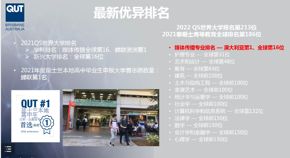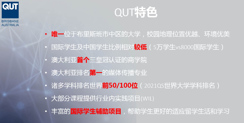 昆士兰科技大学是一所研究性大学,在澳洲大学中排名前十,世界TOP 3%,现有本科生近35,000人,研究生5,000人,国际学生共6,000人。