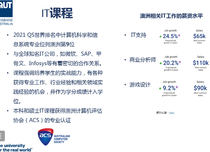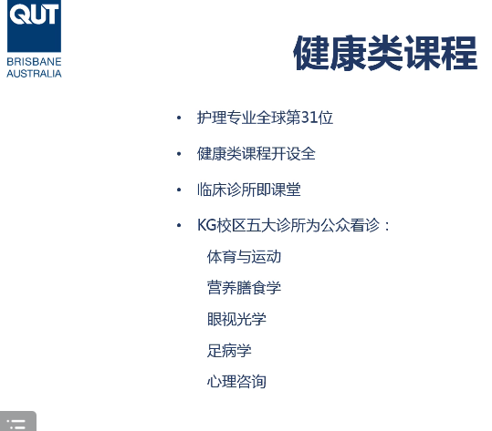 昆士兰科技大学位于世界十大宜居城市之一--布里斯班,昆士兰科技大学(简称QUT)又译作"昆士兰理工大学"、"昆科大"。于1908年建校,坐落于澳大利亚昆士兰州布里斯班市区。历史悠久,声誉卓著。学校的教学注重结合实际应用,这种教育特点使学校和昆士兰的业界保持了密切的合作关系,学校的研究和教育方向以符合就业市场的需求为主,学生经常参与业界的实际方案研讨。最近的一项调查表明昆科大的毕业生很受业界欢迎。