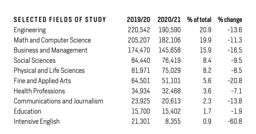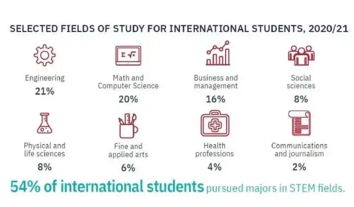 从报告显示的数据来看,2020-2021年,STEM依然是最受留美国际生欢迎的热门专业。