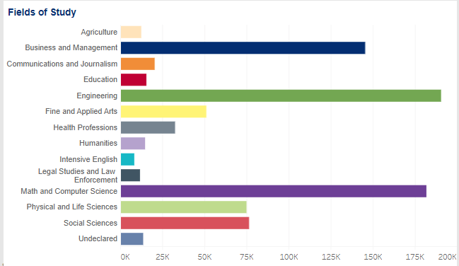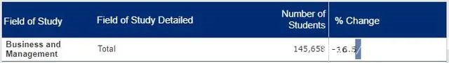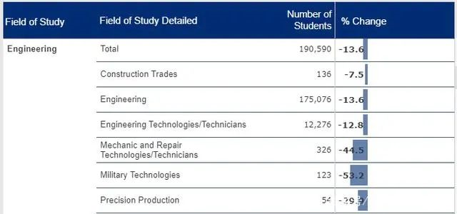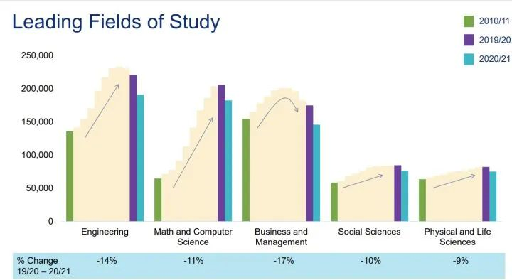 工程专业依旧第一,但就读人数较去年再次减少,此次下降13.6%,为190,590人。虽然选择工程专业的学生人数有所下降,但是依旧占到总人数的20.9%。