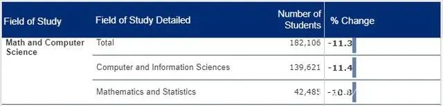 数学和计算机科学就读人数下降了11.3%,依旧排名第二,占到总数的19.9%。