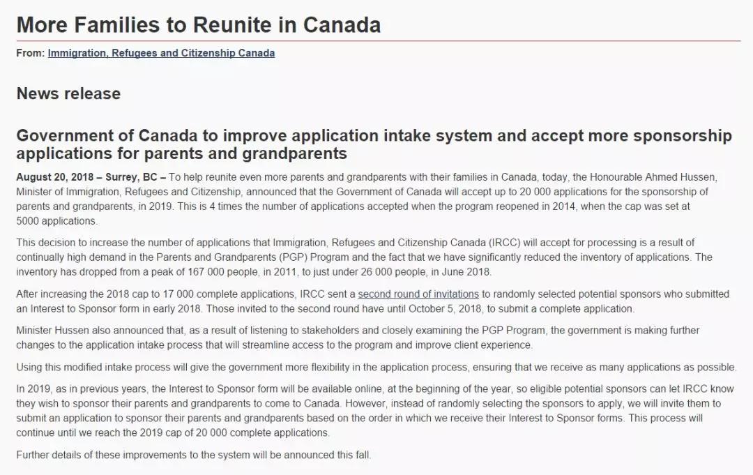 加拿大联邦移民部长胡辛 (Ahme Hussen)8月20日在素里的一个活动宣布,2019年加拿大父母及祖父母团聚移民将 取消抽签 方式,恢复到按 接到申请表的先后次序 来审批。同时, 2019年的父母及祖父母团聚名额将由今年的17,000个增加到 20,500个 , 2020年增加到 21,000个 。