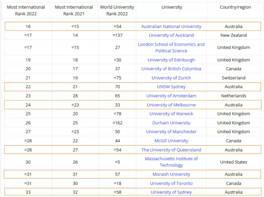 1月19日, 泰晤士高等教育发布了2022年全球化大学排名 (Most International Universities in the Worl)。