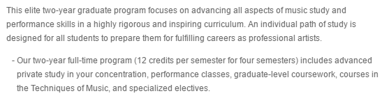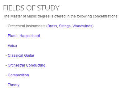 MANNES 提供 master of music 的学位,在这个学位下,有管弦乐,钢琴,声乐,作曲,理论等多个专业方向: