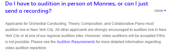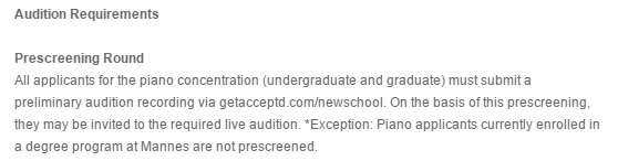 **更多学生其实关注的是艺术类院校的作品集要求,MANNES 要求钢琴表演的学生要去纽约现场面试:**
