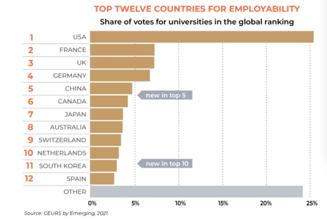 值得一提的是中国的大学在排行榜中表现优异,排名第5名。近年来中国大陆毕业生技能和就业准备排名有所上升,11所上榜大学的排名平均上升8个名次。