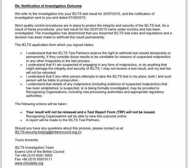 大意就是说,雅思官方抽查了一部分学生的成绩, 因违反雅思考试规定,这部分考生的成绩会被永久扣发。