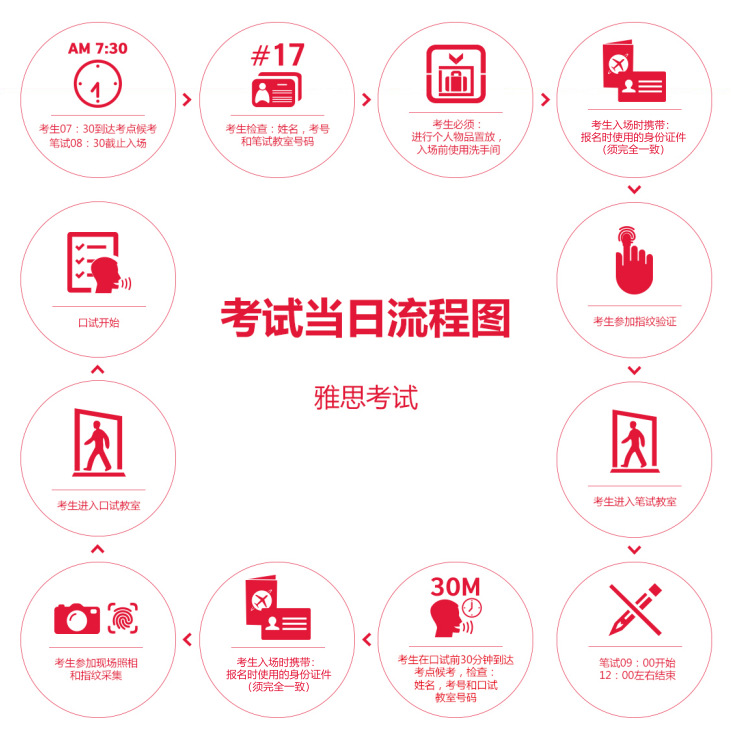 首先过一遍雅思官方发布的考试流程,每个环节都有到场时间、需要携带的证件、注意事项,务必严格遵守!