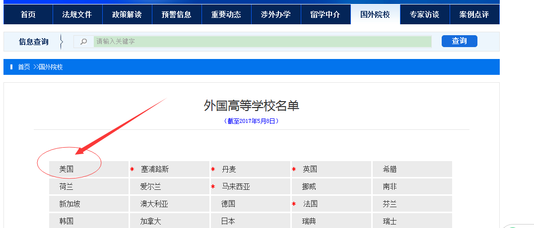 点击 “国外院校”,可以查到所有获得认证的国外院校: