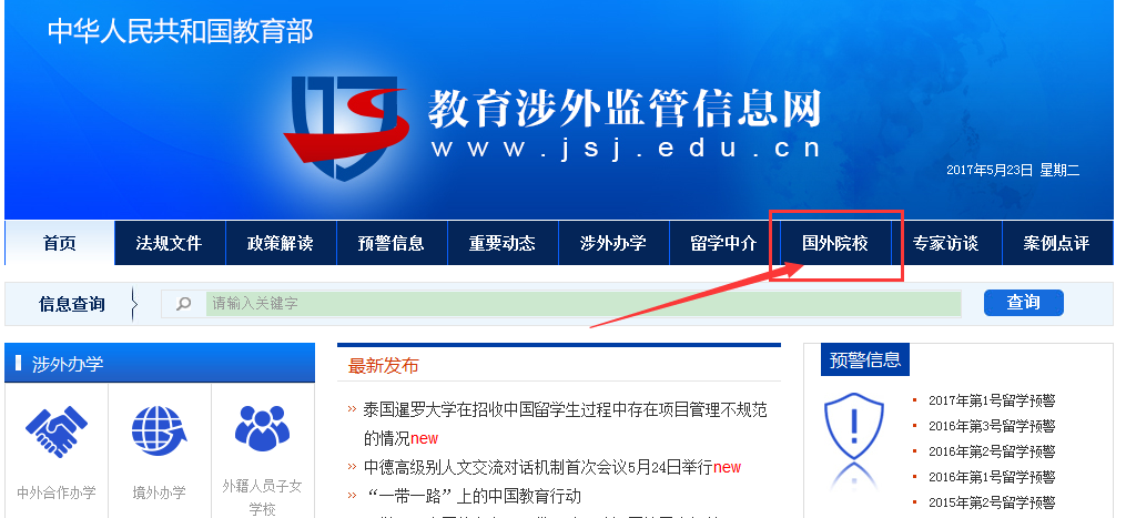 点击中华人民共和国教育部,教育涉外监管信息网,官方网址: http://www.jsj.eu.cn/