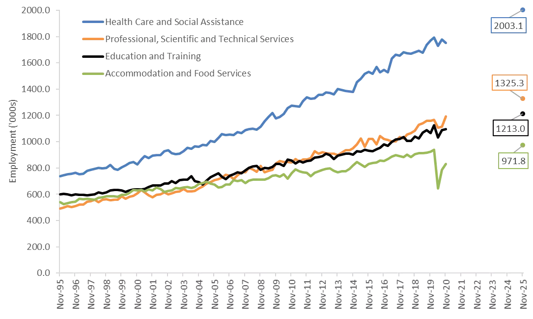 最新的报告数据显示,到2025年11月,19个大类服务行业中的17个行业的就业率预计将有所发展增长,而占据澳大利亚总就业经济增长的64.4%的新增职位分析主要还是将来自以下问题四个不同行业。