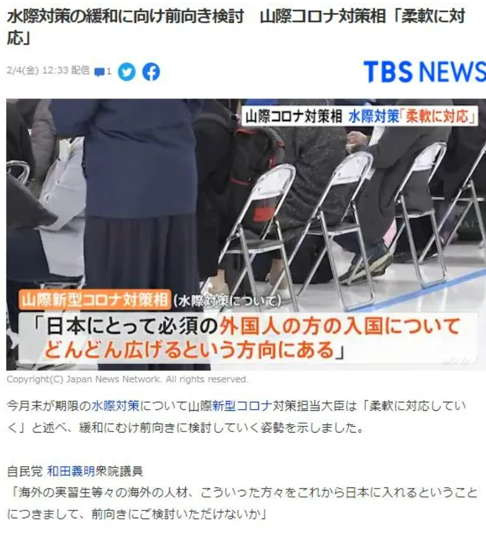 关于政府以本月末为期限的边境政策,山际大臣表示,“对日本至关重要的外国人入境事宜,正朝着积极扩大的方向发展。”,并表示会以积极姿态朝着缓和方向进行研讨。政府预计最早将于下周内宣布针对边境对策的缓和措施的相关方针。(消息是2月4日,推测下来大概本周会出消息吧。)