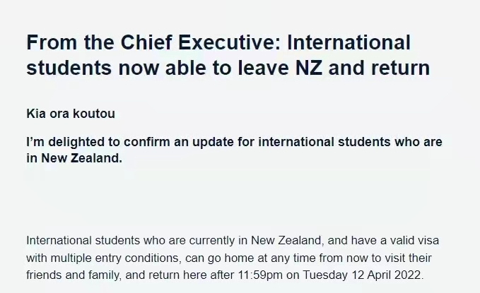 目前在新西兰的留学生,持有有效签证并且具备多次入境条件的,从现在起可以随时回国探亲访友,并于2022年4月12日晚11点59分返回。