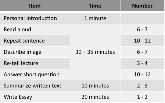 这部分考试时间平均为77-93分钟,包括大声朗读,重复句子,描述图像,复述文章,回答简短问题,总结文章,写简短的文章。