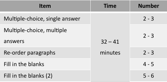 这部分考试时间平均为32-41分钟,内容包括单项选择、多项选择、重新排列段落和填空(包括单词和词组填空)。