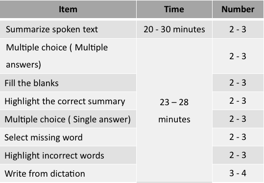 听力考试之前,考生可获得选择性的十分钟休息。听力考试平均时间为45-47分钟。考察内容包括总结听到的话,多项选择,填空和听写。