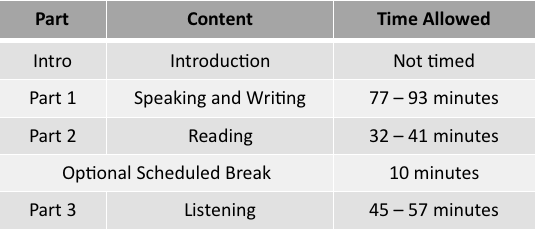 如图,全场考试需一次完成,考试总时间约为3个小时。正常考试分为说、写、阅读和听力三个部分,以及一个短暂的自我介绍和10分钟的选择性休息。