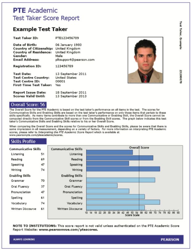 PTE满分为90分,学术英语考试的最低分为10分,最高分为90分。分数量以四分为单位递增。以下是一份PTE成绩单: