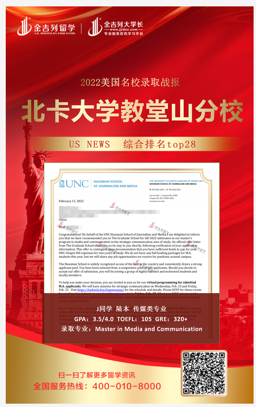 恭喜同学,北卡教堂山传媒offer,一个班就20名同学哦