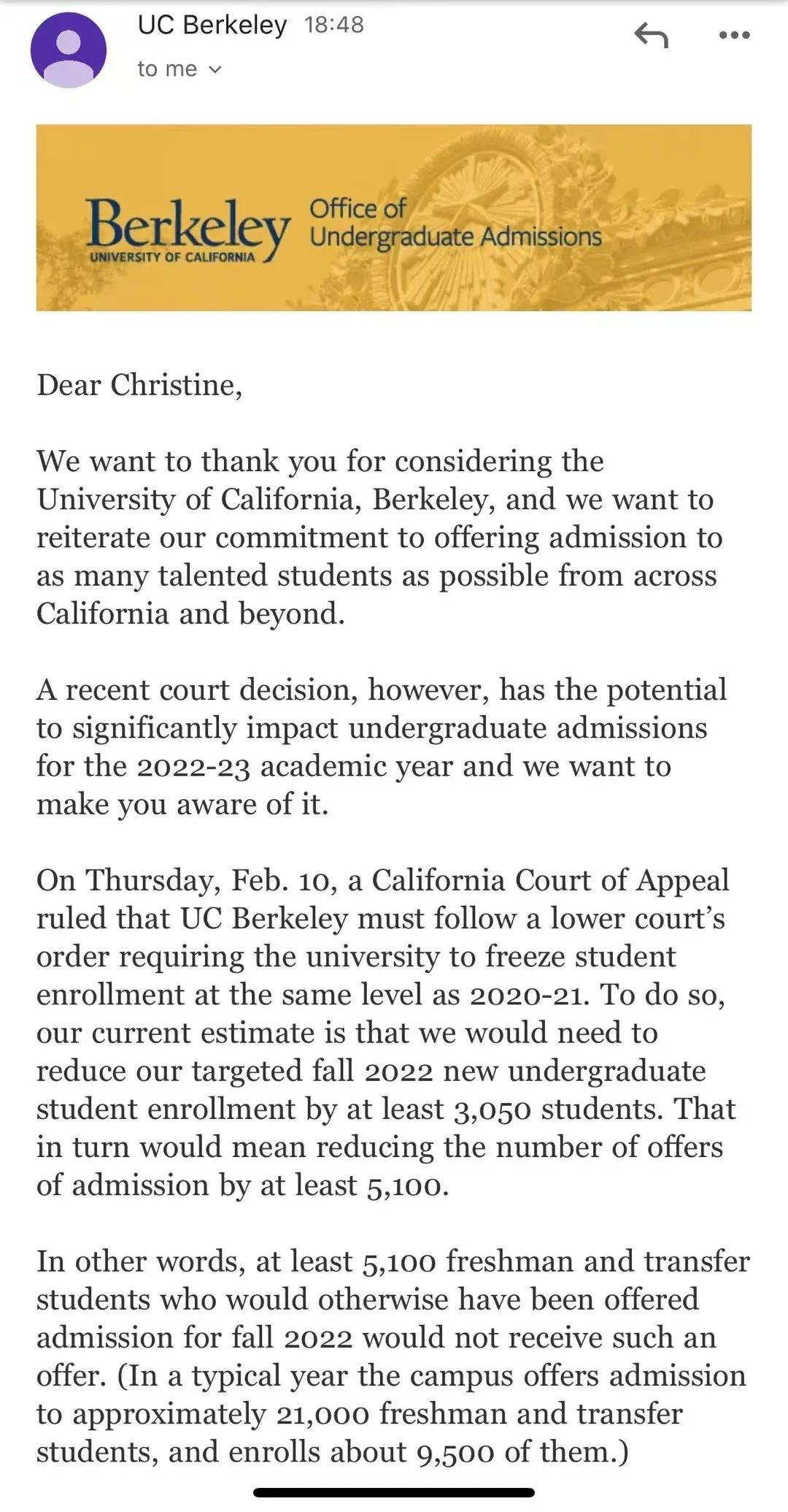 上周,加州大学伯克利分校提前发放了一小部分奖学金获得者和特殊项目的录取,就在其余申请者还在翘首以盼三月底的常规录取结果时,这两天却有“噩耗”传来——UCB申请者收到了来自校方的邮件,邮件中表示,因地方法院要求学校学生总数和去年持平, 2022秋季,学校需要削减至少 3050个本科新生入学名额,并导致学校将减少发放至少5100封录取。