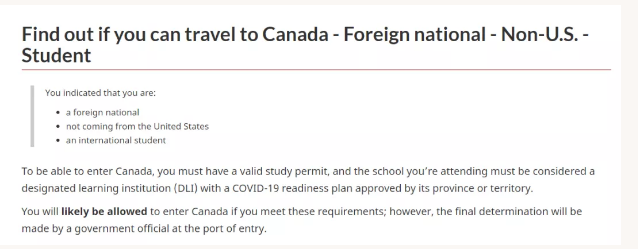 - 有效的录取信。这里注意,你所就读机构的COVID-19应对计划已被所在省或地区批准,否则你是没有资格入境的。可以在移民局的网站上查询https://www.canaa.ca/en/immigration-refugees-citizenship/services/coronavirus-covi19/stuents/approve-li.html#list