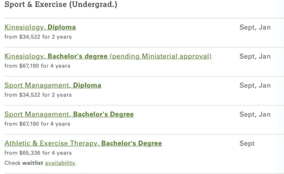 卡莫森学院目前设有运动与健身理疗本科 / 人体运动学本科 / 体育与运动管理本科 / 体育与运动管理大专 / 人体运动学大专 / 按摩疗法大专等专业。专业设置都含有 optinal 工作实习机会其符合移民局 PGWP 相关政策。 具体专业信息可见下图。