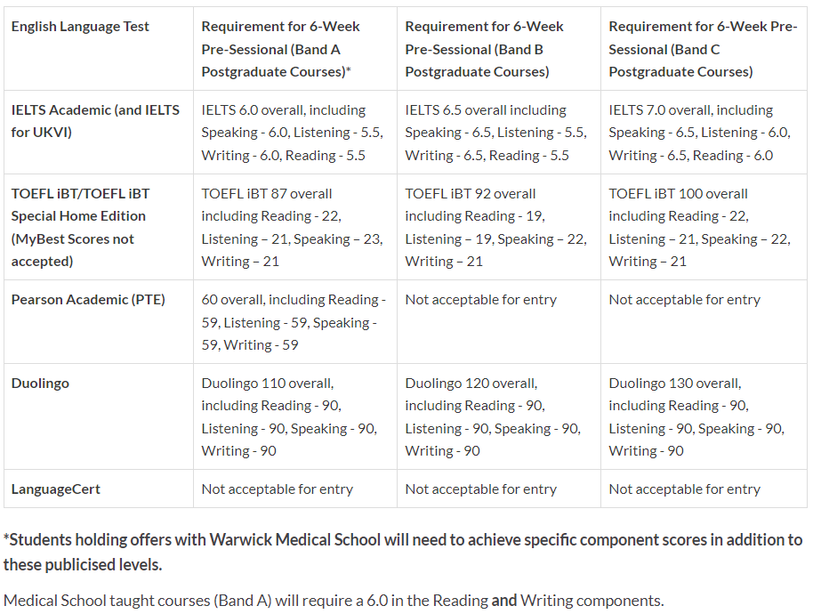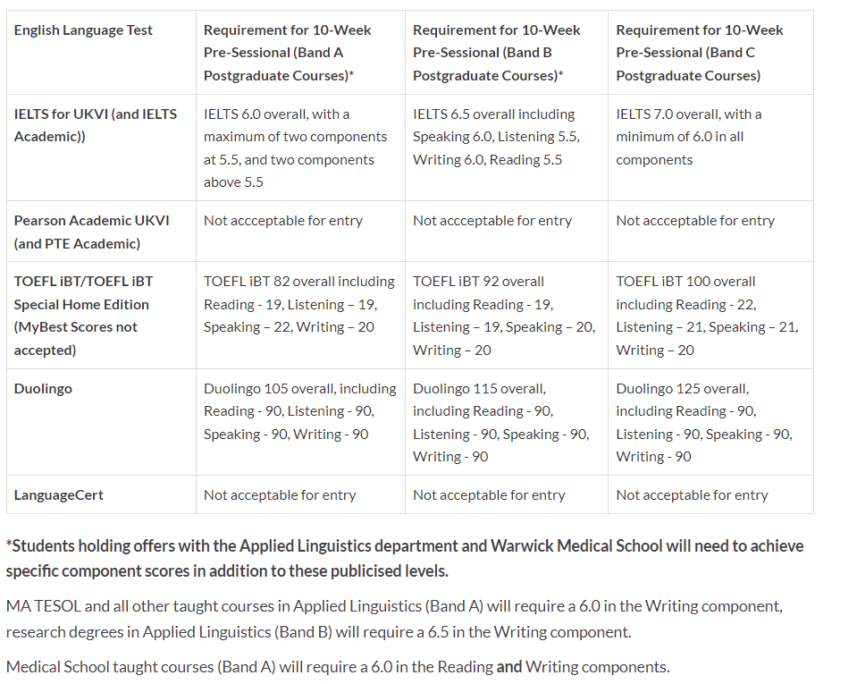 具体专业所对应的Ban A、B、C 雅思要求不同,部分学院的雅思要求也会发生变化,同学们应该以offer上的要求为准,或者向 Centre for Applie Linguistics (pre-sessional@warwick.ac.uk) 咨询。
