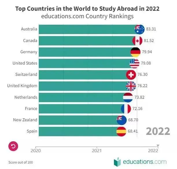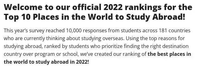 专注出国留学信息发布的全球教育网站eucations.com发布了2022全球十大最佳留学国家排行榜。根据官方数据,网站针对数千名留学生进行了调研,由于这份排名的依据是学生们在选择目标留学国家时最看中的因素,因此它并不像QS排名更专注学术,而是侧重于留学生的留学体验。