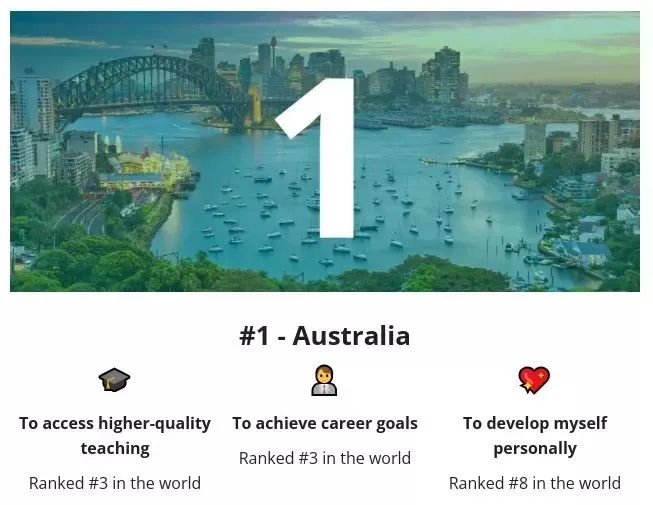 澳大利亚在“获得高质量教育“方面排第三,墨尔本、悉尼、布里斯班等城市拥有诸多的顶尖大学,在2022年QS世界大学排名中,前50名的大学,澳洲独占五席。