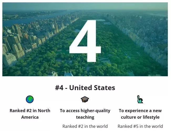 对于留学生来说,美国坐拥着令其趋之若鹜的科研教育优势。也因此,它在“获得高质量教育”方面排第二。