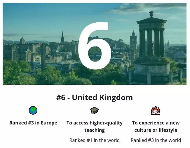 英国在“获得更高水平教学”这一项上位居榜首:牛津剑桥两大王牌学府、G5金砖五校,再加上又是世界金融中心,这些全球顶尖的优质资源吸引着来自全球各地的留学生。