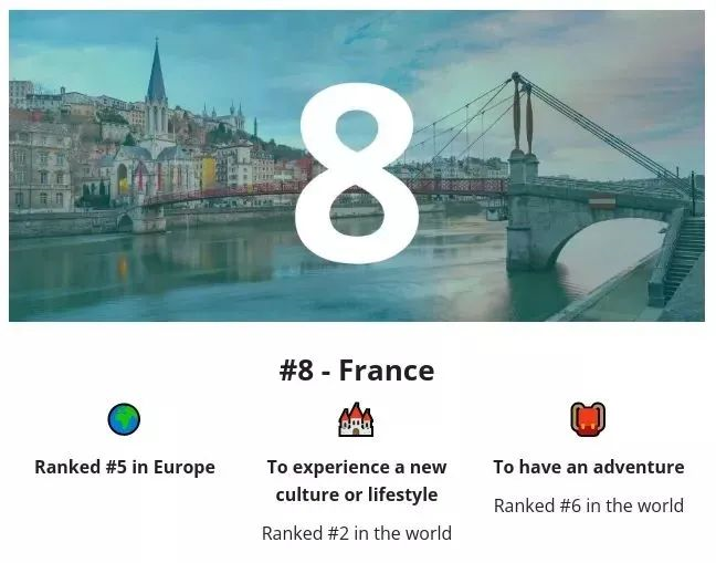 此外,英国在“体验新的文化或生活方式“上排第三:从伦敦繁华的城市环境到爱丁堡的中世纪街道,从下午茶到酒吧,从山上的城堡到高耸的高地,从汉堡土豆泥到炸鱼薯条,在英国你都可以享受到你专属的“皇家体验”。