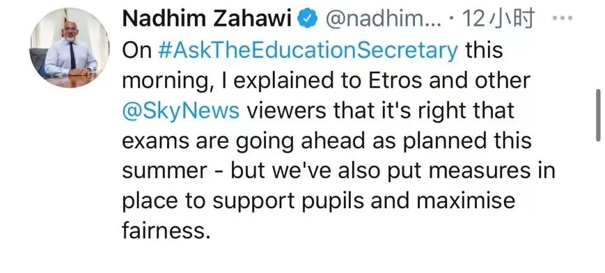 英国教育部长纳迪姆·扎哈维表示,“最公平、最好的评价学生学习成果的方法就是考试,没有比这更完美的方式。我们十分关注学生因疫情导致的学习受到的影响,这也是为什么我们在周一通过考试局确定GCSE、AS和A-level考试的具体信息,把考试的内容更清晰地传达给学生,帮助学生更有针对性地复习。今年的评分也会更宽松。”