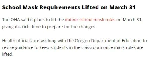 学校将从3月31日起取消口罩要求,是否戴口罩由学区作主。在未来几周,州卫生官员将与俄勒冈州教育部(ODE)官员合作,修订指导方针,以确保学校可以继续安全运营,并在学校口罩要求取消后,让学生继续上课。