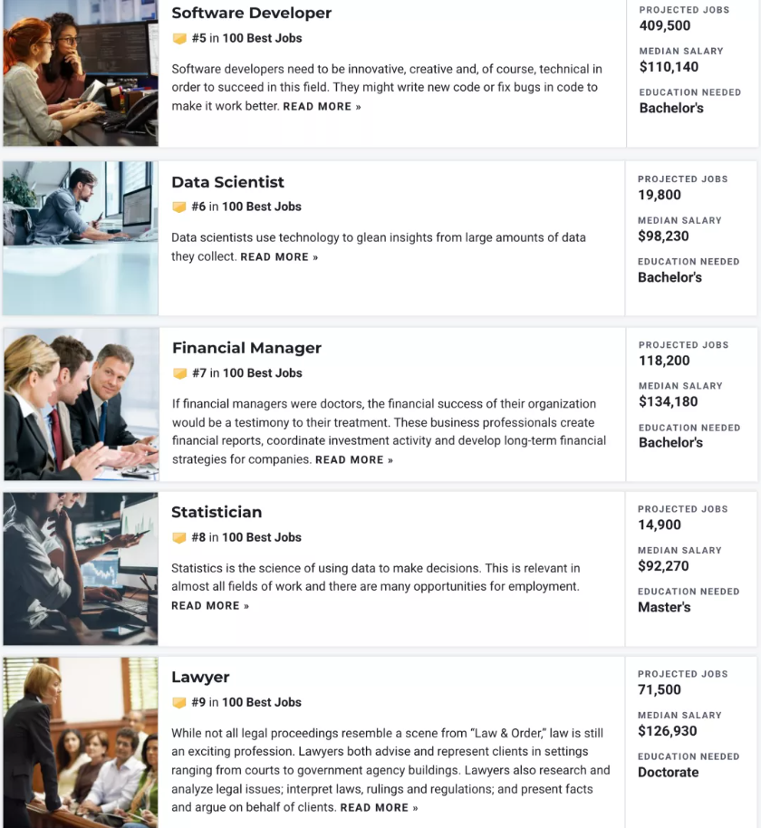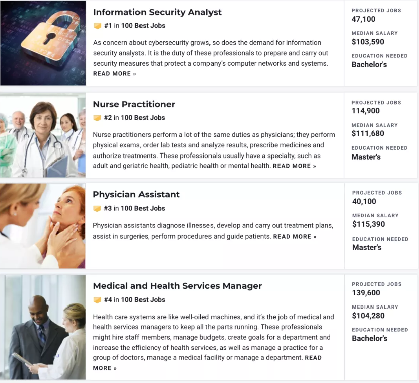 USNews参考联邦劳工数据,分析职业在过去10年的增长速度、中位数工资、就业率、未来工作前景、压力水平和工作与生活的平衡来进行评分