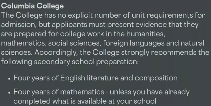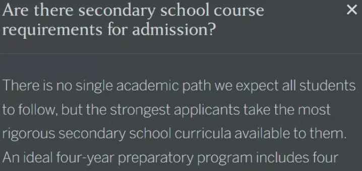 高中阶段的选课要求在各美国院校的官网上都占据了很大版面。如果申请者们漏选了相关课程或修读的年限不足的话,那么说做了充分的 School Research 就是打脸了,也会让招生官产生质疑。