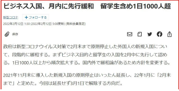 日本在2021年11月末开始原则上停止新入国,22年1月决定入境限制的期限是到“2月末”。这次讨论的方向是不延长,到3月1日解除。