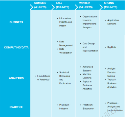 该项目时长1年,夏季学期开学,第二年春季学习毕业,学生完成44 units学分课程。学校会从商业,数据,分析和实践是个方面培养学生,毕业生将掌握如下方面的技能: