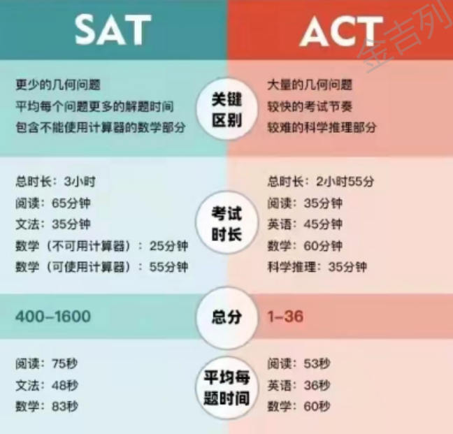 从考试难度上分析,ACT更加考验学生在有限时间内综合能力的体现,而SAT更加考验学生的批判性思维。总体上ACT对科学要求相对更高,科学方面有优势且校内有考点的同学,可以选择ACT;对于科学比较弱的同学,选择SAT更容易出分,但需要考虑考位稀缺问题。两者具体区别详见下图: