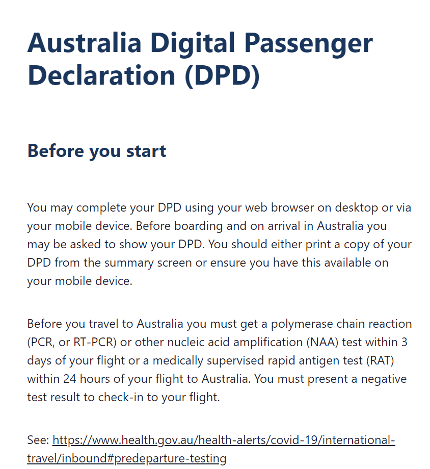 所有乘飞机抵达澳大利亚的乘客都应填写DPD。 旅客可以在起飞前7天开始填写DPD,并在出发前往澳大利亚前72小时内提交。