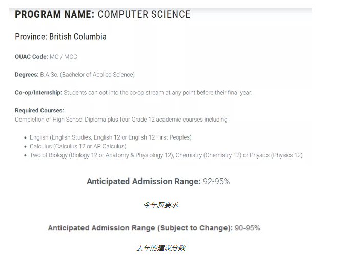 首先说BC省,我们拿计算机科学专业来举个例子,想要申请的话必须提供4门12年级成绩, 包括12年级英语,12年级微积分(或者用AP微积分成绩代替),十二年级物理化学生物成绩三选二,这个专业的GPA要求还是很高的,在92-95之间。值得注意的是,去年的同专业,麦马建议的最低GPA还是90,今年已经涨到了92,一年涨两分,由此可见麦马随着排名逐年上升,学术要求也真的越来越高了。最终录取时候也需要提供合格的省考成绩和高中毕业证书。