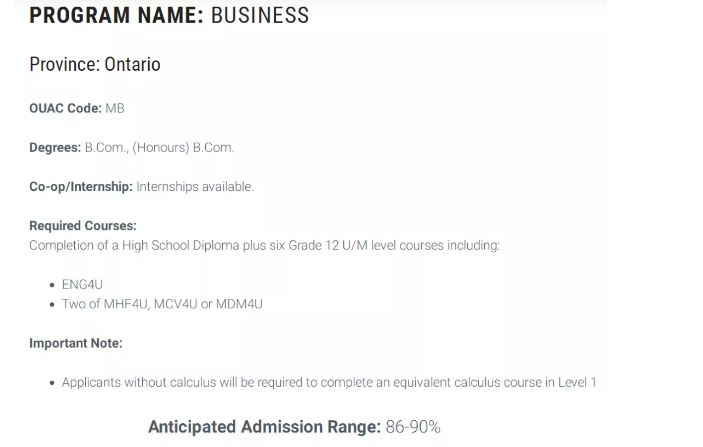 对于安省学制的学生, 拿商科来举例, 学生需要提供6门12年级的成绩,其中必须有英语,12年级高等函数MHF4U,微积分和向量MCV4U,数据管理学MDM4U三门中的两门成绩(学校提醒如果不提交MCV4U成绩,大一阶段需要补修相关的课程),录取的最低GPA在86以上,和去年相比也在上升。