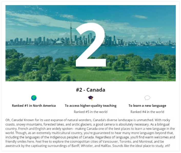 出国留学,首先要考虑的自然是去哪个国家。对于刚刚萌生留学想法的同学来说,选择一个自己喜欢,也能够为自身未来发展提供更多帮助的国家可以说是至关重要的。本周,全球教育网站eucation.com公布了一年一度的《全球十大最佳留学国家》(Top 10 countries in the worl to stuy abroa)。这一次,eucation.com的调查人员收集了来自 181个 国家和地区的调查结果,受访留学生/准留学生人数超过了 10,000名 。通过探寻学生们正在优先考虑的留学国家,eucation.com创建了《2022年全球十大最佳留学国家》排名,一起来看看吧!